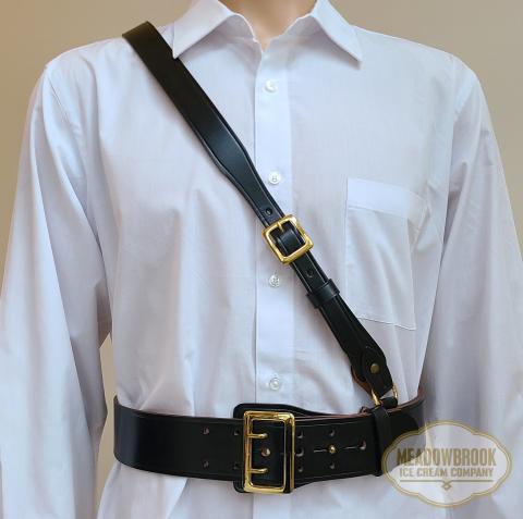 A complete and correct uniform belt set as worn by Good Humor men and women since the early 1930s. The belt is made of 2.25" high-quality genuine heavy black leather and includes leather cross-over strap and all solid brass hardware. Stitching is intact with permanently attached "D" rings and double-hooked buckle that can be adjusted for proper fit. This belt is for a 40" waist (fits up to a size 42" waist) and is in excellent condition. Note the hat and shirt in the photos are not included and are only for example purposes (see our other listings for hat purchase options).