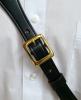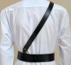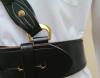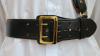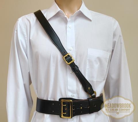 A complete and correct uniform belt set as worn by Good Humor men and women since the early 1930s. The belt is made of 2.25" high-quality genuine heavy black leather and includes leather cross-over strap and all solid brass hardware. Stitching is intact with permanently attached "D" rings and single-hooked buckle that can be adjusted for proper fit. This belt is for a 36" waist (fits up to a size 38" waist) and is in excellent condition. Note the hat and shirt in the photos are not included and are only for example purposes (see our other listings for hat purchase options).