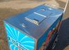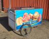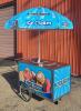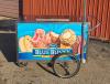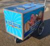 Dry ice-cooled ice cream cart with Blue Bunny Ice Cream branding and umbrella, measuring 55.75" long x 37" wide x 52" high (including umbrella pole).