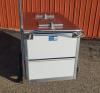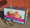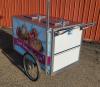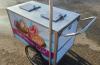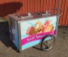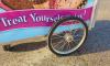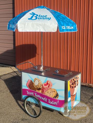 Dry ice-cooled ice cream cart with "Treat Yourself" graphics and Blue Bunny umbrella, measuring 59" long x 37.5" wide x 52.75" high (including umbrella pole). Including the following features: