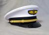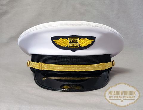 A vintage white Good Humor Man uniform hat as worn by Good Humor men from the early 1950s to late 1970s. This hat features a beautiful all-weather white vinyl cover with leather sweat band, and the size is 7-1/4 to 7-3/8. It is in mint condition.