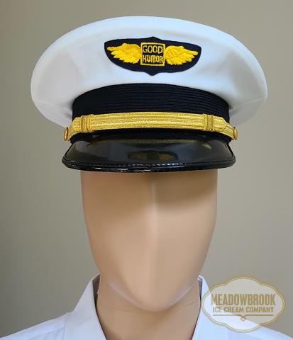 A vintage white Good Humor uniform hat as worn by Good Humor men and women from the early 1950s to late 1970s. White with gold embroidered badge. This hat features a leather sweat band, and the size is 7. It is in excellent condition.