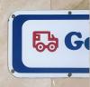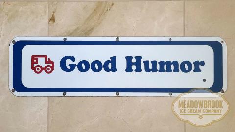 An original porcelain Good Humor sign from the front of a 1968 Good Humor Ice Cream Truck. The sign measures 28.75 inches wide by 8 inches high. It is glossy with bright color, great porcelain shelving, and some of the original mounting grommets. There are a few chips on the front of the sign (see photos).