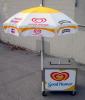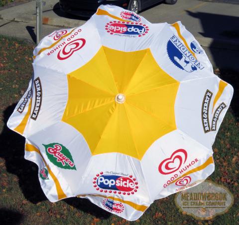 A new authentic commercial Multi-Brand Good Humor Ice Cream Umbrella and support pole. Easy to use, reliable, and attractive to promote your events and products. This umbrella features Good Humor, Popsicle, Klondike, Ben & Jerry's, and Breyers Ice Cream logos. It measures 59" tall with a 72" diameter when fully set up and comes with a 45" support pole that allows for quick and easy height adjustment.